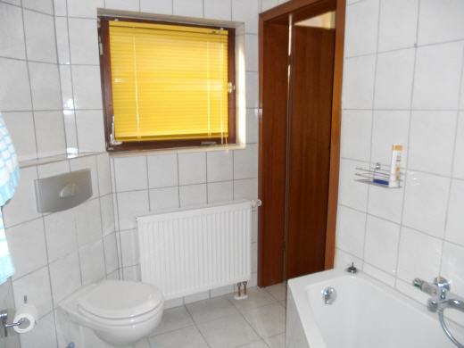 Das Badezimmer verfügt über eine Badewanne mit Duschwand, sowie ein WC und Waschtisch. Desweiteren ist vorhanden ein kleiner Satz Handtücher, Kosmetiktücher, ein Föhn, sowie Toilettenpapier.