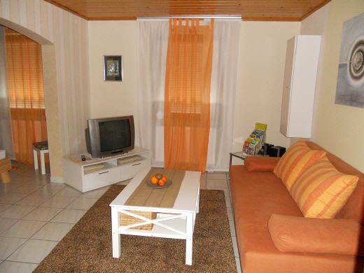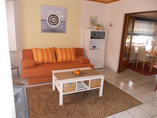 Das Wohnzimmer bietet eine gemütliche Couch mit Schlaffunktion. Für Ihre Unterhaltung sorgt ein TV-Gerät (Kabel-TV), sowie eine Stereoanlage und Radio mit CD.